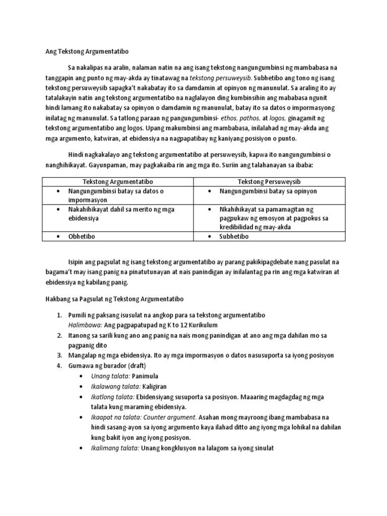 View Notes - Tekstong Argumentatibo from DSW 411 at Central Philippine University - Jaro Iloilo City. Save Sweek 3 - Tekstong Persweysib at Argumentatibo For Later. Maaari din itong maging tekstong nagpapahayag ng pagkakatulad o pagkakaiba ng mga bagay.