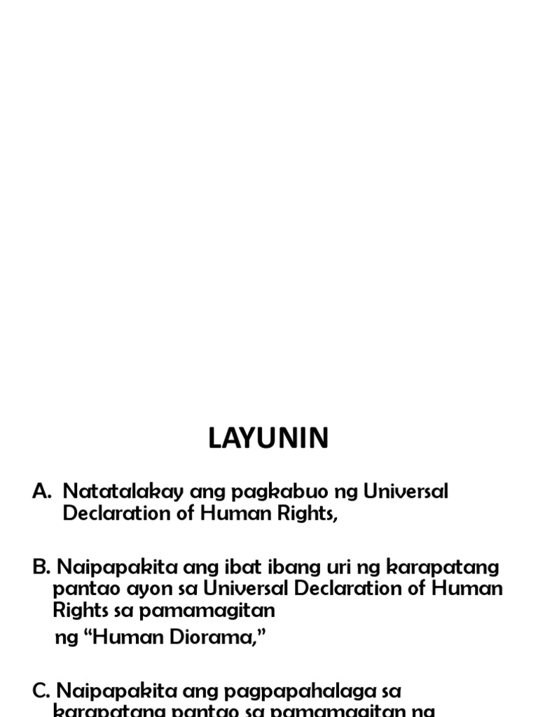 2paglalahad ang ating bagong aralin ay tungkol sa kasaysayan ng karapatang pantao universal declaration of human rights at billo of rights. Ang UDHR o Universal Declaration of Human rights ay pangkalahatan at ito ay pinagtibay ng UN. Natatalakay ang pagkabuo ng Universal Declaration of Human Rights B.