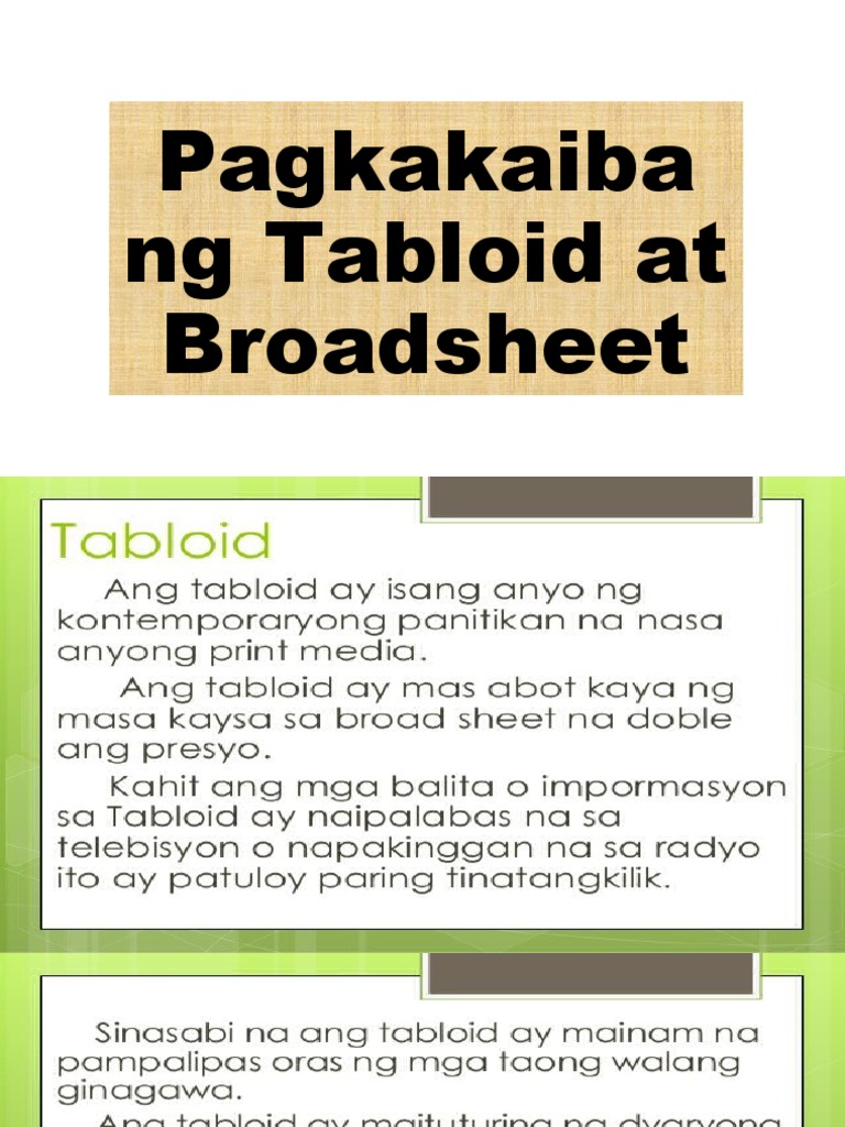 Scribd is the worlds largest social reading and publishing site. PAGKAKAIBA NG BROADSHEET AT TABLOID Ang tabloid ay may sukat na maliit lamang samantalang ang isang broadsheet may laki at mahaba ito. Panitikan Tabloid komiks magasinat mga kontemporaryong dagling katha 2.