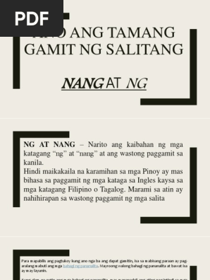 Gabay sa Kaibahan Wastong Paggamit ng Ng at Nang sa Pangungusap NG AT NANG Narito ang kaibahan ng mga katagang ng at nang at ang wastong paggamit sa kanila. 108 000 9718 330 An. Nakapagpapaliwanag sa kaibahan ng pasalita at pasulat.